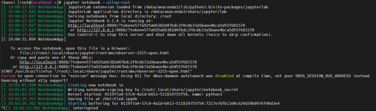 현재 root로 접속중인 상태이므로 jupyter notebook --allow-root 명령어 사용