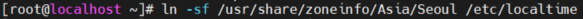 기존에 등록되어 있던 /etc/localtime의 링크를 바꾸기 위해 ln -sf /usr/share/zoneinfo/Asia/Seoul /etc/localtime 명령어를 사용하여 로컬시간 링크를 Seoul로 변경합니다.